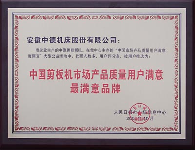 由人民日報社市場信息中心主辦、中國物流與采購聯(lián)合會、中國紡織工業(yè)協(xié)會、中國輕工機械協(xié)會等60多家權威行業(yè)協(xié)會、《工人日報》、《科技日報》等10家權威報刊、人民網(wǎng)及搜狐網(wǎng)等權威網(wǎng)站協(xié)辦支持,為期三個多月的“中國市場質(zhì)量用戶滿意度調(diào)查”大型公益活動終于揭曉。我公司生產(chǎn)的中德牌剪板機,在本次公益活動中,投票人數(shù)多,用戶評分高,被用戶推選為:中國剪板機市場產(chǎn)品質(zhì)量用戶滿意最滿意品牌。